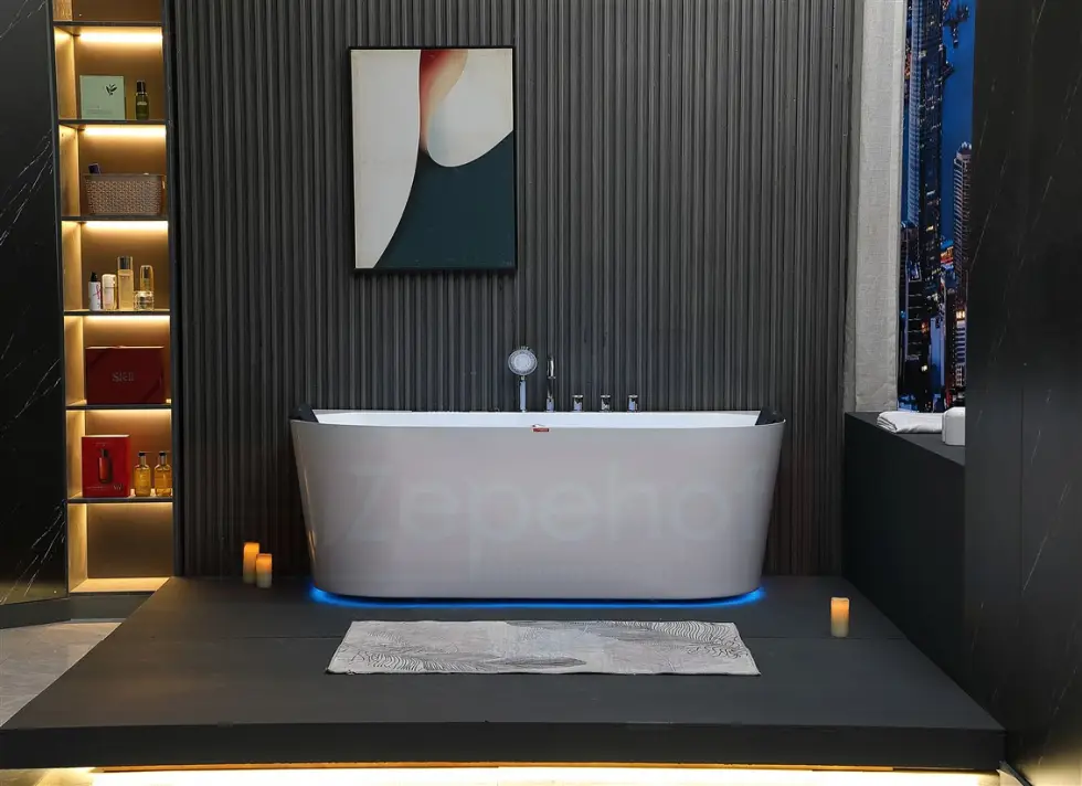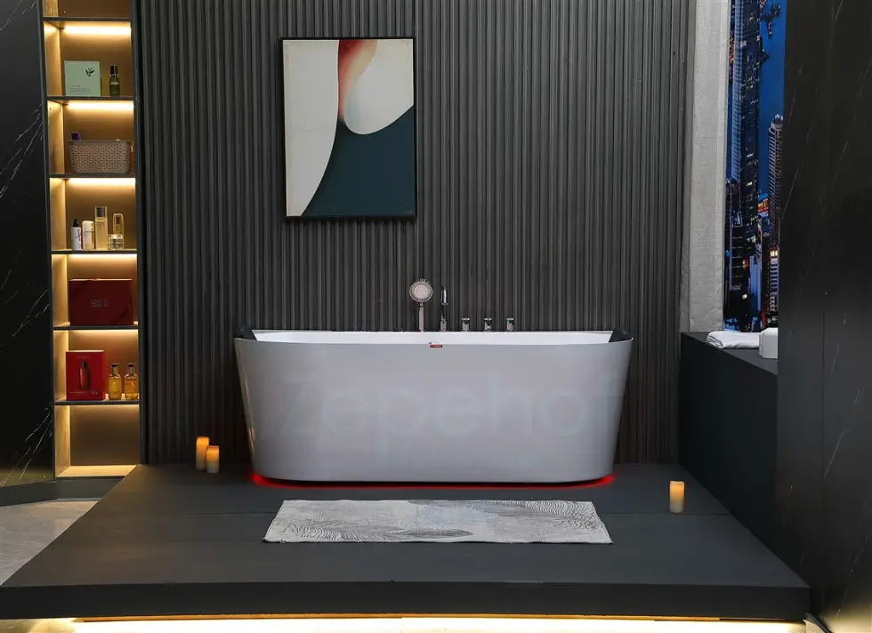 Wanna zaprojektowana w ten sposób, iż zapewnia przestrzeń i czystą formę. Brak zbędnych elementów nadaje łazience poczucie wielkości. Nowoczesna prosta forma bez zbędnych wzorów w akrylu oraz nasadek na śrubach.