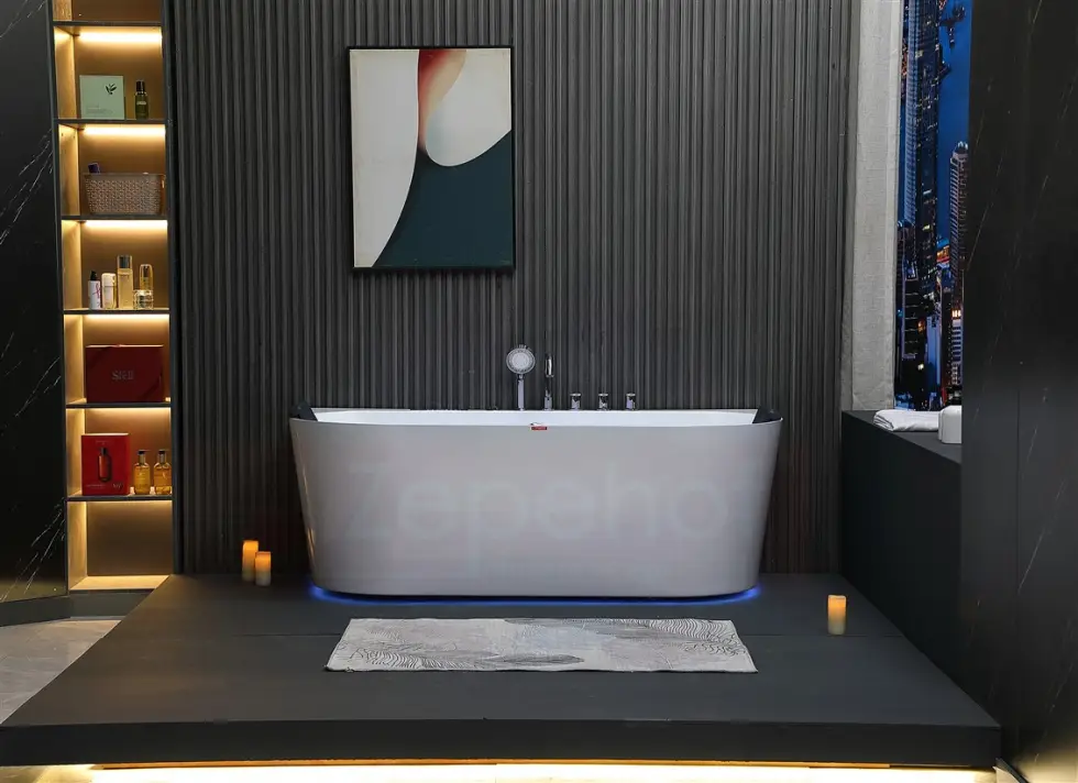 Akryl sanitarny czterowarstwowy biały o grubości od 8mm-15mm, wzmocniony od spodu włóknem szklanym i żywicą o grubości 13mm-17mm. Akryl jest odporny przed uszkodzeniami i zarysowaniem. Armatura wykonana z stali chromowanej.