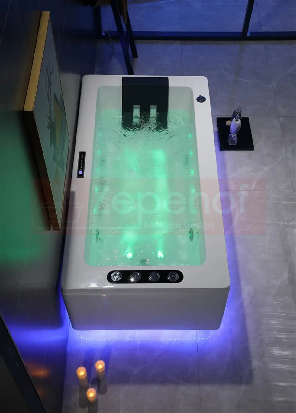 - Elektroniczny efektownie podświetlany panel sterowania (sterowanie: masaż, radio, oświetlenie, ozon, itd.)